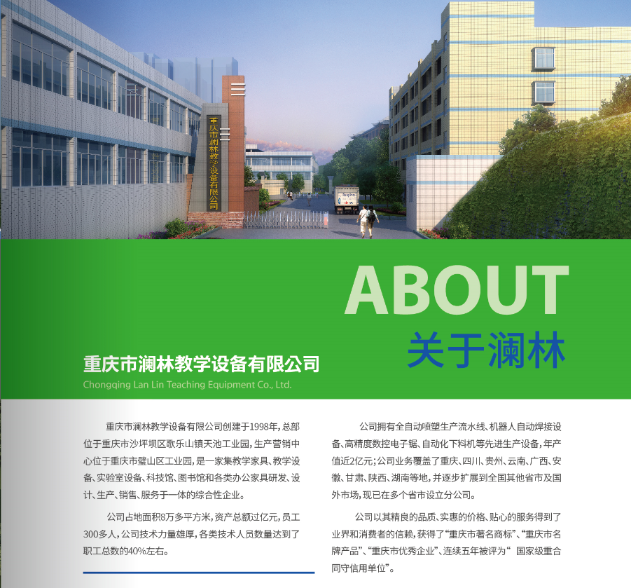 重庆市澜林教学设备有限公司创建于1998年,位于重庆市璧山区工业园,是一家集教学家具、教学设备、实验室设备、科技馆、图书馆和各类办公家具研发、设计、生产、销售、服务于一体的综合性企业。公司占地面积8万多平方米,资产总额过亿元,员工200多人,公司技术力量雄厚,各类技术人员数量达到了职工总数的40%左右。公司拥有全自动喷塑生产流水线、机器人自动焊接设备、高精度数控电子锯、自动化下料机等先进生产设备,2019年产值1.2亿元;公司业务覆盖了重庆、四川、贵州、云南、广西、安徽、甘肃、陕西、湖南等地,并逐步扩展到全国其他省市及国外市场,现已在多个省市设立分公司,公司以其精良的品质、实惠的价格、贴心的服务得到了业界和消费者的信赖,获得了“重庆市著名商标”、“重庆市名牌产品”、“重庆市优秀企业”、“国家高新技术企业”、连续五年被评为“ 国家级重合同守信用单位”。