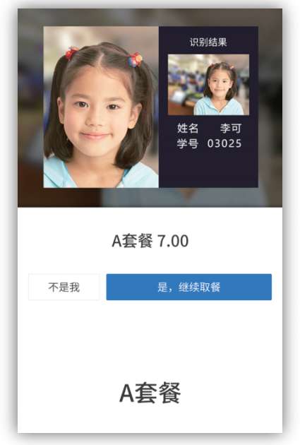 由学校提供可选的营养套餐,家长通过手机应用提前给孩子预订好未来一周的餐食,学生饭点到档口通过刷卡、刷脸取餐即可。完美解决食堂排队、学生抢饭等问题。