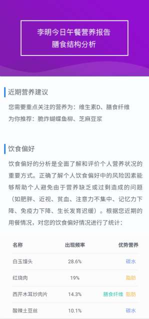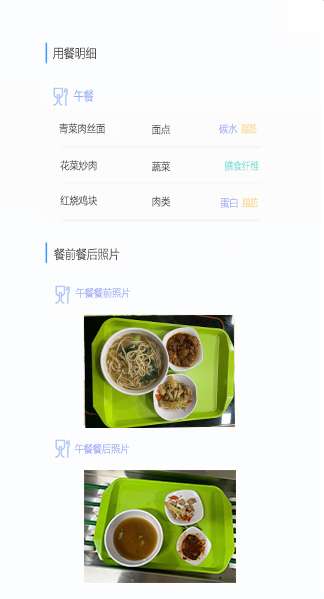 而在家长端,方案新增了“膳食营养报告”推送服务,通过对比餐前餐后照片,“孩子吃多少”家长一目了然。还能根据当天用餐明细,分析出孩子的营养素摄入情况,并给出个性化的科学饮食建议。