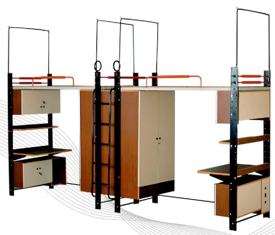 最初,在上下铺的公寓床形式中,下铺的床下会用来放鞋子或者脸盆,公寓的其他地方可能会为每个人安排一个小柜子用来存放物品。