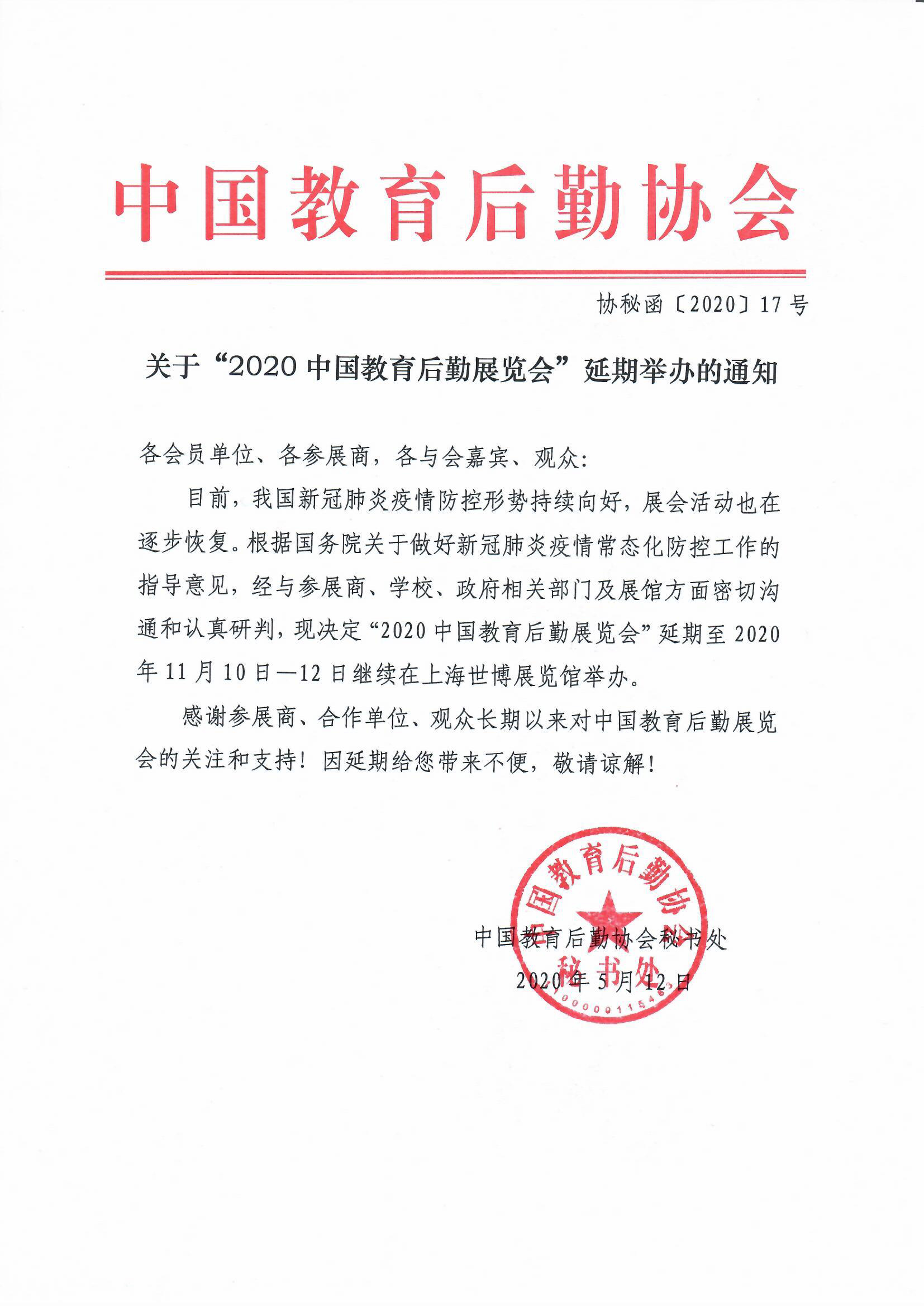 目前,我国新冠肺炎疫情防控形势持续向好,展会活动也在逐步恢复。根据国务院关于做好新冠肺炎疫情常态化防控工作的指导意见,经与参展商、学校、政府相关部门及展馆方面密切沟通和认真研判,现决定“2020中国K8凯发官网网址览会”延期至2020年11月10日—12日继续在上海世博展览馆举办。