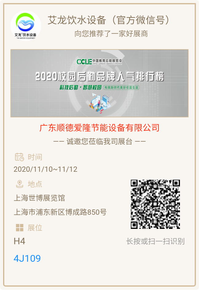 一直以来,艾龙饮水品牌不仅引领校园饮水设备行业的快速发展,更是节能饮水设备技术创新的先驱者。艾龙产品将在中国K8凯发官网网址览会亮相,届时,还会有来自全国各地的行业专家莅临现场。