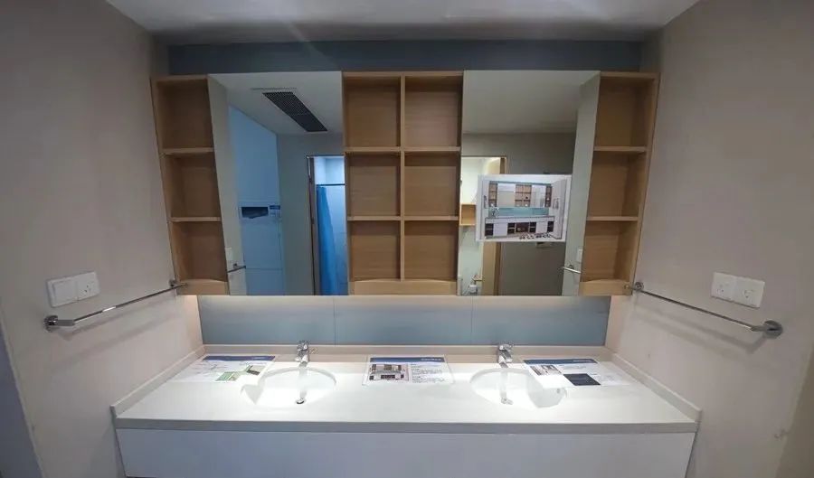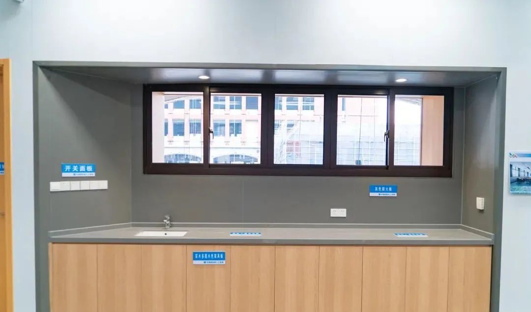 走进宿舍楼,可以看到楼里采用了集成卫浴系统和集成式墙面系统,而在办公楼和教学楼处则使用了集成吊顶系统。所有部件都是加工好后直接现场安装,这种干式作业法实现了环保施工、即装即住。