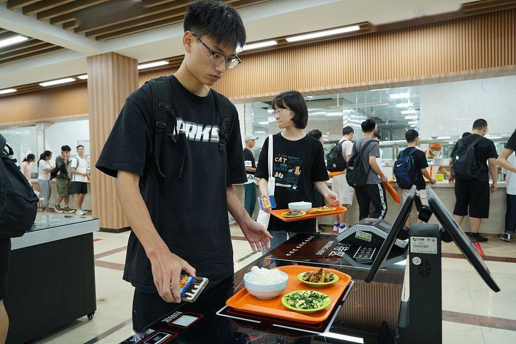 浙江农林大学,食堂里的师生们端着自己选好的饭菜来到计价区,计价系统根据菜品自动完成计费,既方便快捷,又高效有序,也减少了相互间的接触,更加卫生安全。