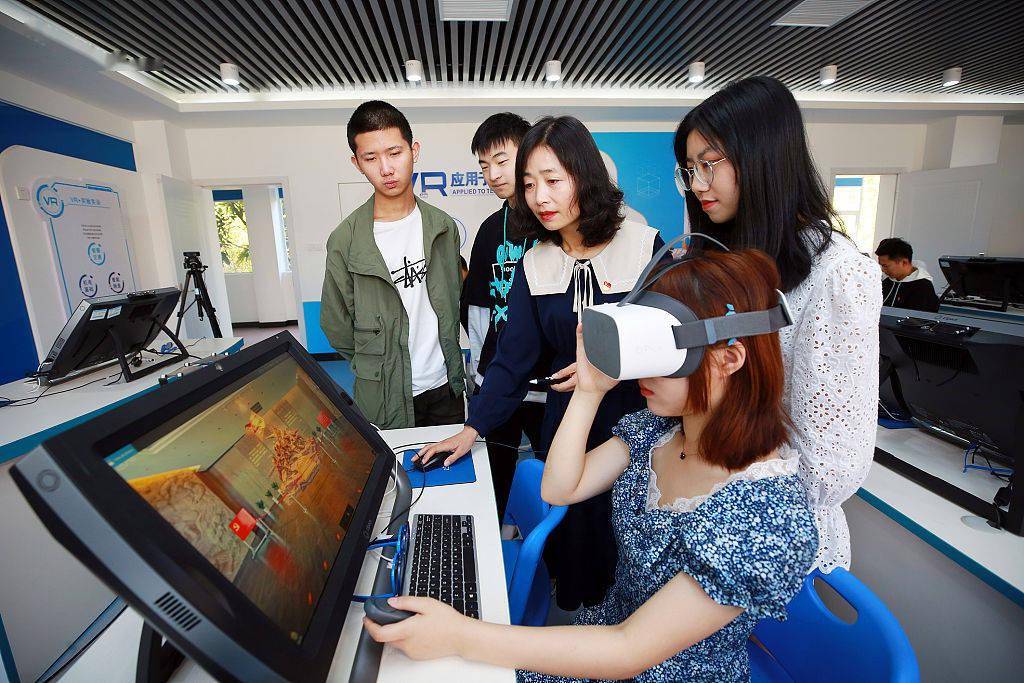 浙江广厦建设职业技术大学,VR实训室内,老师让学生们戴上VR眼镜,畅游沂蒙革命纪念馆,感受“黑科技”带来的360度视听盛宴,沉浸式体验“红色教育场景”。