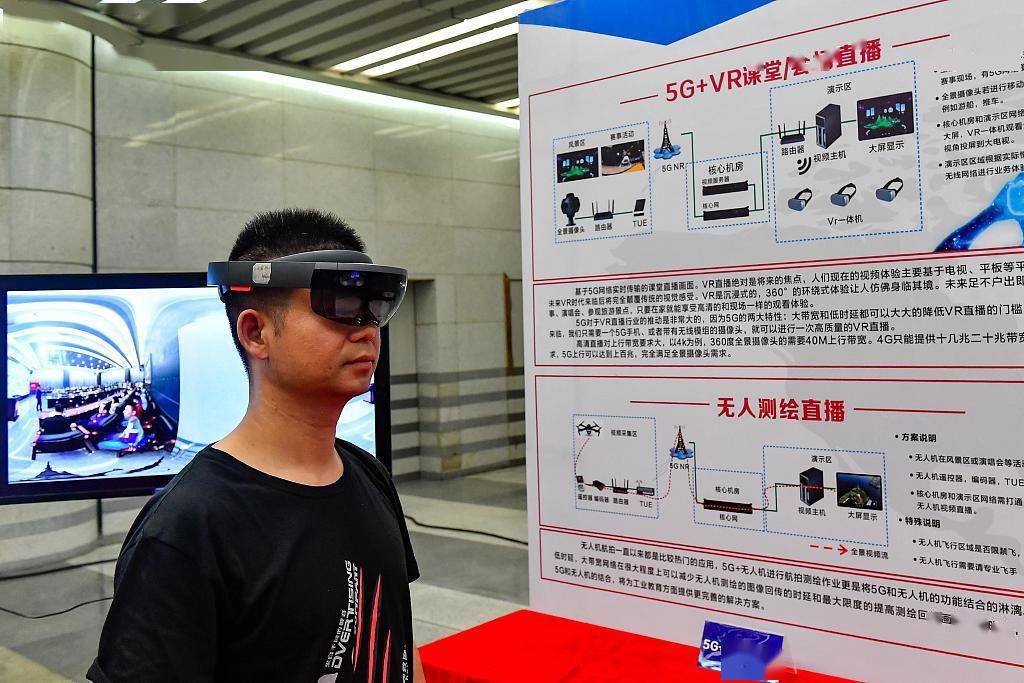 广东工业大学,工作人员演示“5G+VR”课堂直播系统。2019年,广东工业大学与广东移动联手打造面向5G应用的智慧校园服务体系,推出远程4K高清直播互动课堂、AR/VR(虚拟现实)教学应用,仿真远程实训、5G 远程全息投影教学等教学应用。