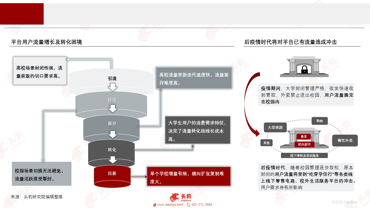 校园场景封闭性强,假期场景切换、人员代际流动等现实问题无法避免,平台面临用户流量增长及转化困境,而后疫情时代也将对平台已有流量造成冲击,行业入局者需思考流量维护及未来发展方向。
