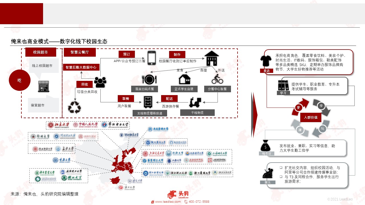 俺来也以高校为基点,精准聚焦受众群体,把握持续化高频刚需,从餐饮切入赛道,依托校园资源并协同未途科技打造智慧校园下的数字新零售。俺来也前期积累基础流量,后期叠加拓展“穿”、“学”、“住”、“行”等板块业务,以本地生活流量带动供应链经销及品牌广告传媒,与产业链上各环节共建关系并创造价值。