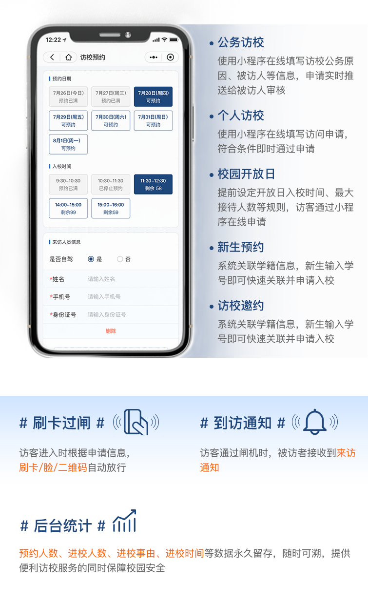 申请入校无需经历冗长流程,针对不同入校情形提供差异化预约方案,不管是个人来访、校园开放日、新生到校还是来访邀约,均可快速在线完成入校预约流程,轻松应对不同场景下的入校管控!