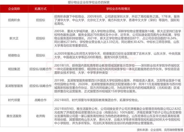 面对行业门槛较高、专业性较强的学校物业细分领域,这类物业企业主要通过公开招投标获取高校服务项目,虽然缺少校方提供的优质业务资源,但凭借优质的服务以及运营能力,在招投标中依然保有较高的竞争力,从深耕优势区域到全国性布局,逐渐扩大学校业态布局范围。