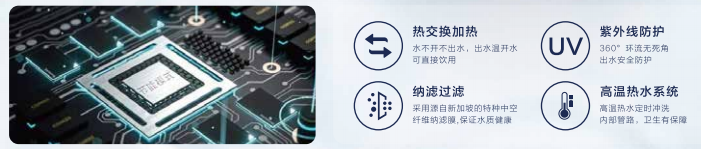 热交换系统,热水传递热量给冷水,可降温为温水,冷水吸收热水的热量,提升热罐的净水温度,35°C - 45°C可以调节,可以随心根据季节需要选的对健康有益的水温。