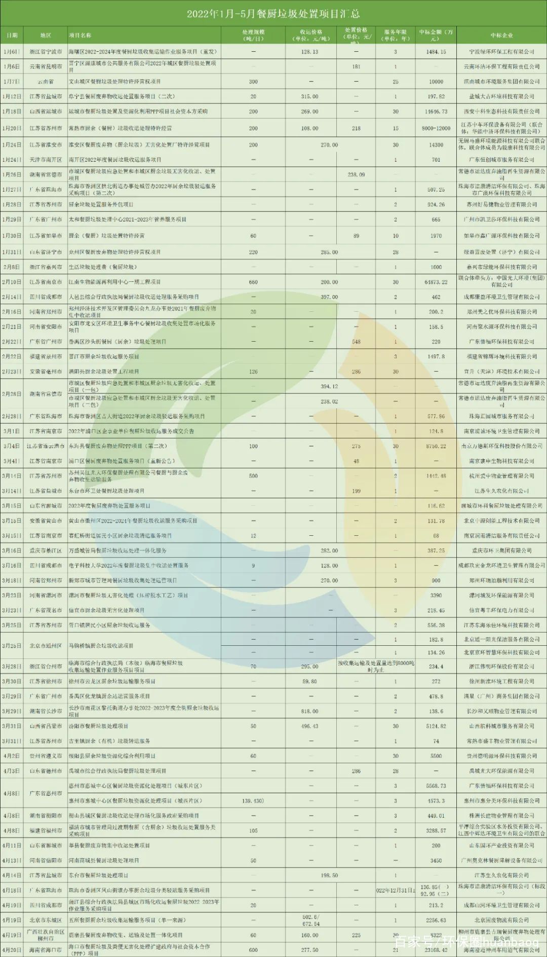 ▲2022年1月-5月餐厨垃圾处置项目汇总
