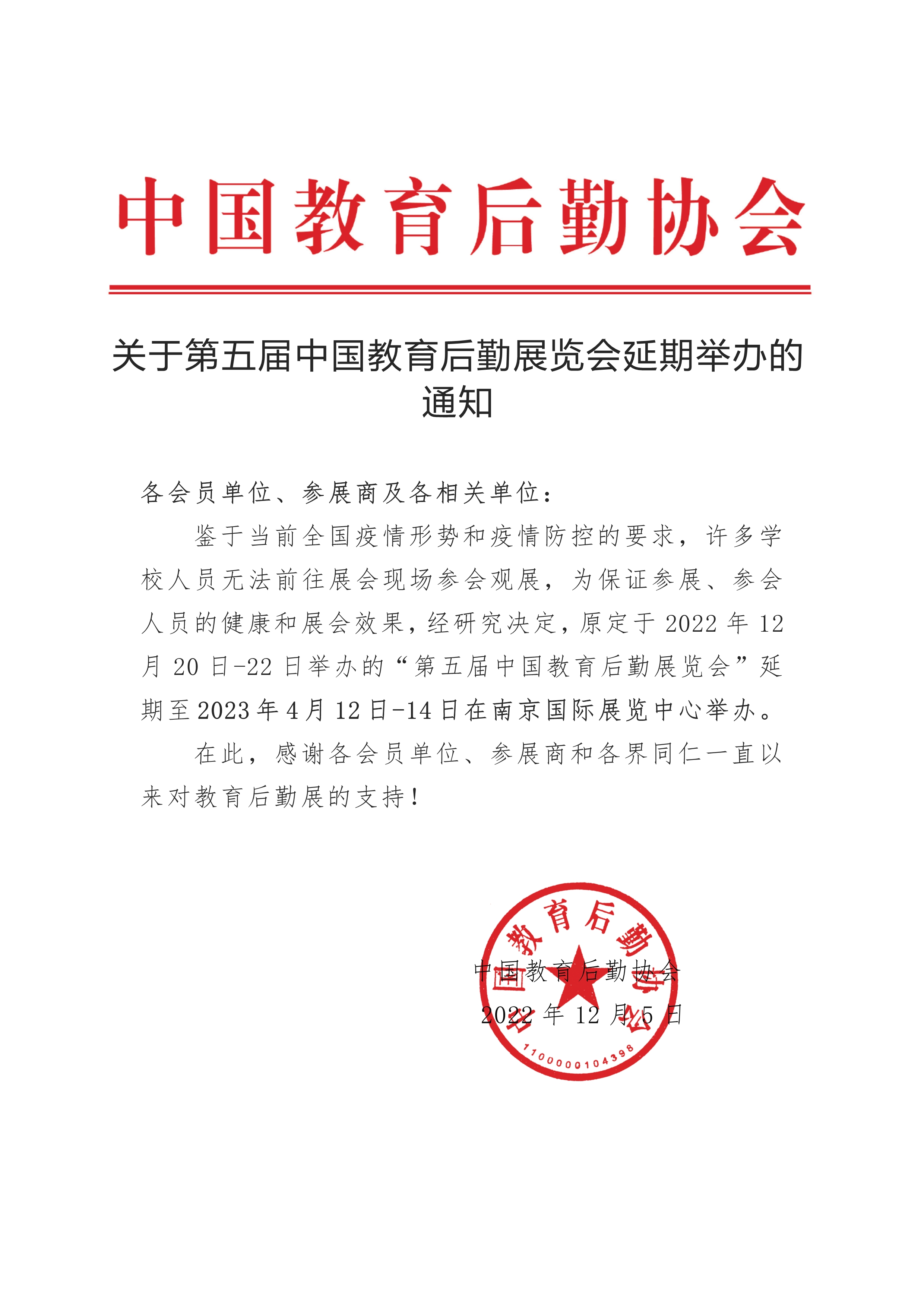 鉴于当前全国疫情形势和疫情防控的要求,许多学校人员无法前往展会现场参会观展,为保证参展、参会人员的健康和展会效果,经研究决定,原定于2022年12月20日-22日举办的“第五届中国K8凯发官网网址览会”延期至2023年4月12日-14日在南京国际展览中心举办。