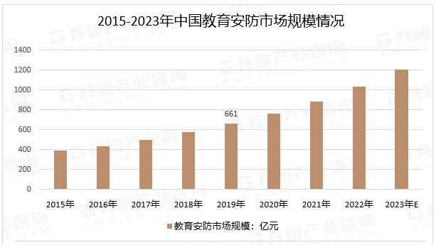 近年来,校园安防行业市场规模稳定扩大,据相关数据统计,2015年我国校园安防市场规模为389亿元,到2019年已经增长至661亿元,预计在2023年有望达到1200亿元左右。