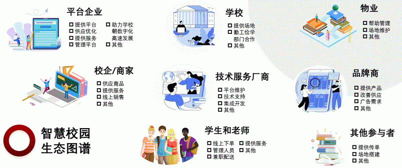 校园服务场景是智慧校园建设场景中的重要一环。现如今,智慧校园行业参与者众多,包括平台企业、学校、校企/商家、用户、品牌商、技术服务厂商、物业以及其他参与者,行业参与者间合作共赢,共同打造新一代校园服务,形成了庞大的行业生态。