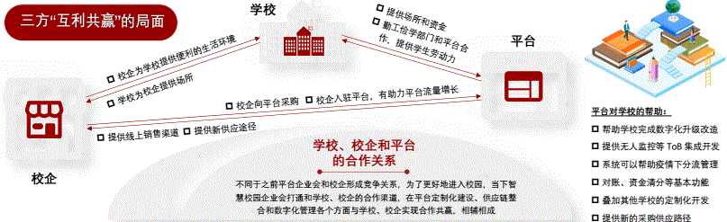 其中,平台企业打通和学校、校企的合作渠道,在平台定制化建设、供应链整合和数字化管理各个方面。