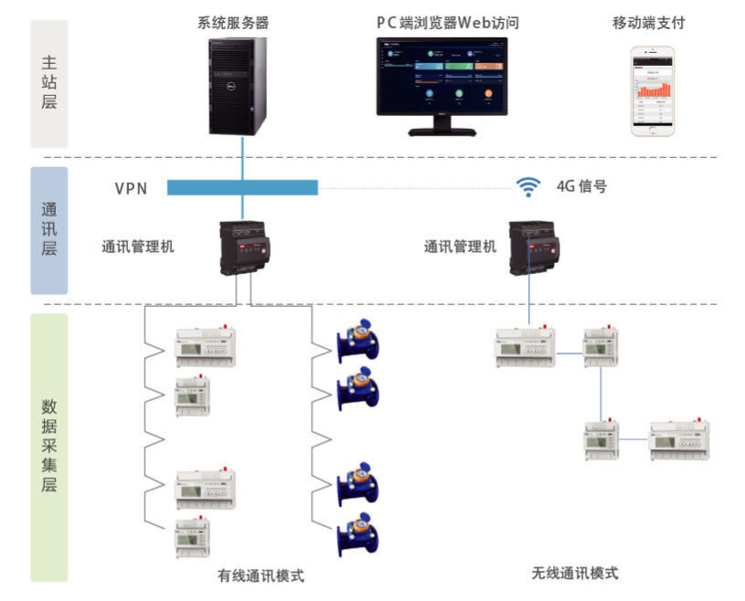 综合在线计量收费系统是基于B/S架构,可以实现远程抄表、预收费管理、用电安全监控为一体的综合水电管理系统。系统支持多种便捷支付方式(包括现金、微信、支付宝、网银及校园一卡通等)。预付费采用标准协议加密,在保证资金安全的同时,可以轻松地实现线上购电购水,系统支持完整的数据记录、数据查询、异常告警、欠费拉闸等功能,支持定制接入第三方表计实现计量、收费,可和能管系统进行模块化结合,同步共享数据。