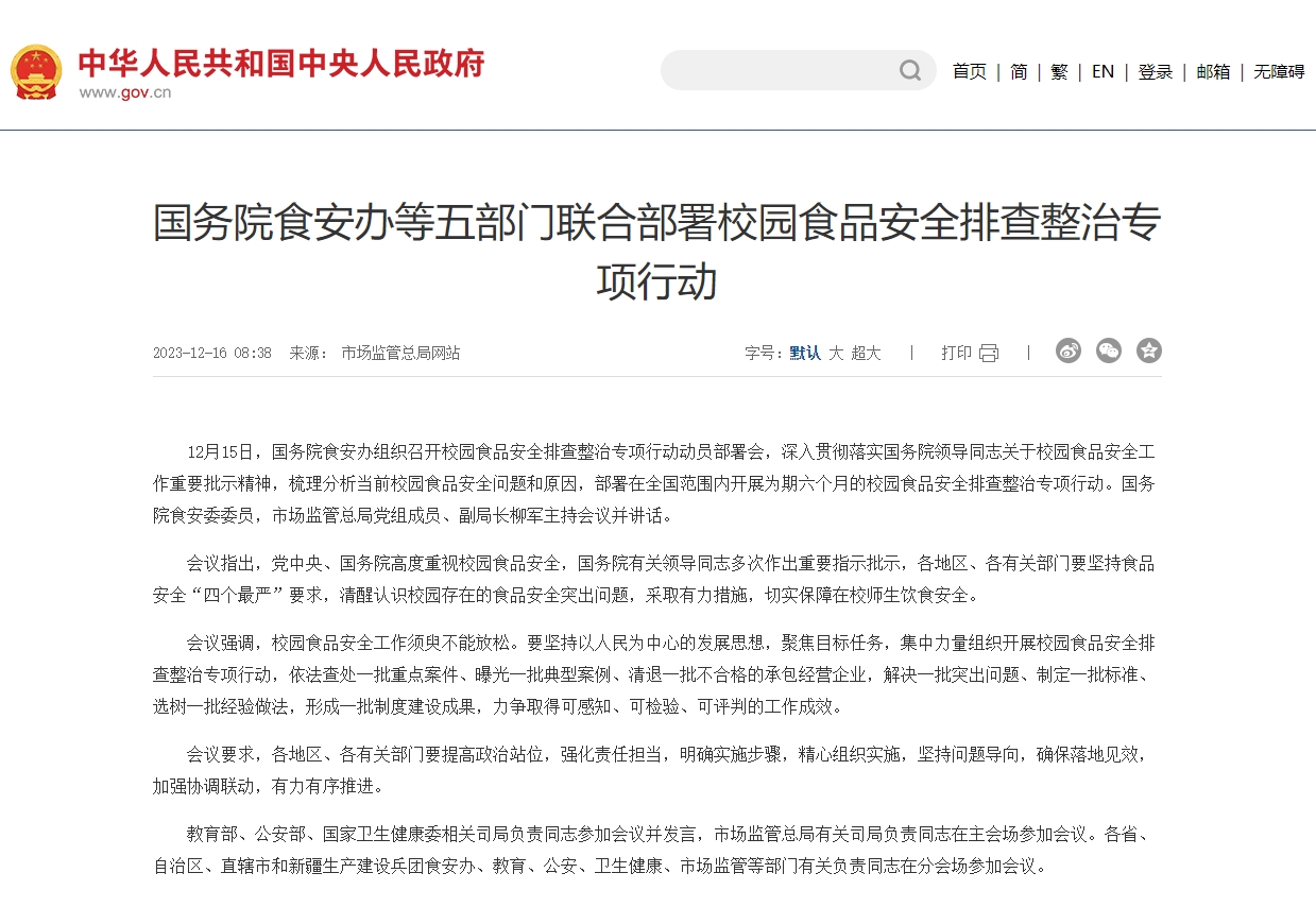 近日,国务院食安办组织召开校园食品安全排查整治专项行动动员部署会,梳理分析当前校园食品安全问题和原因,部署在全国范围内开展为期六个月的校园食品安全排查整治专项行动。