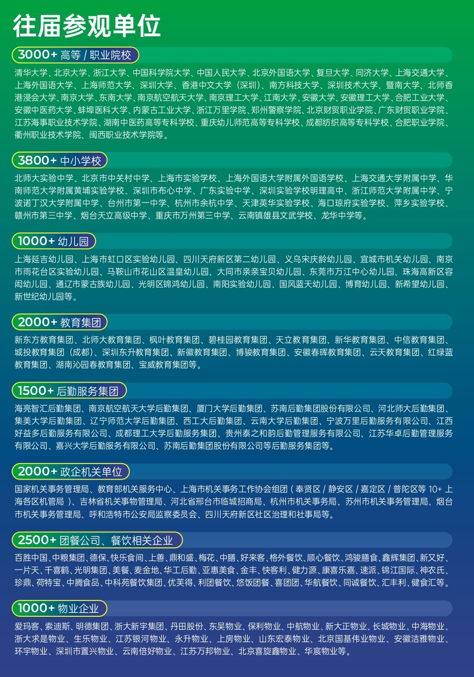 展会聚焦学校大后勤全领域,展示智慧餐饮、能源管理、校园信息化、校园物业、校园安全、健康空间、环保家具、商贸自助、基建与修缮、连锁品牌、校园文创、中小学后勤等12大领域N个细分业态的新产品、新服务、新方案。