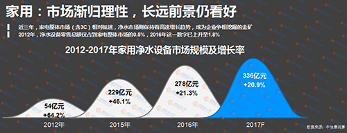 中怡康研究数据显示,2012年整个家用净水的规模只有54亿,到今年年底预计会达到336亿,市场容量增加了5倍,这是第一个需要关注的点。从数据可以看到,从2016年开始,整个市场增长速度放缓,最近两年维持在20%左右的增长速度。在2015年之前,市场增长速度在50%左右,甚至更高,这是要关注的第二点。2012年,净水产业只占全体家电销售额的0.5%,也就是说贡献了0.5%的销售规模,2016年这个数字已经上升到1.8%。中怡康预计,2017年,这个数字会上升到2%以上。
