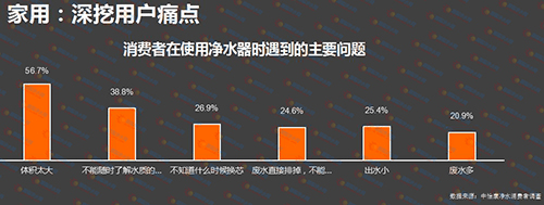 消费不断升级,用户对产品的新能、外观、服务都是在不断提升,这也是企业不断开发产品,不断推动产品发展的原动力。根据中怡康的调研结果,用户对产品的吐槽点或者痛点主要集中在体积太大,不能随时了解水质,不能监控到换芯还有出水量等问题,这些痛点都在不断推动企业加速升级产品。从近几年企业新品开发的方向来看,确实得到了很多改观。比如节省空间的问题。中国的厨房与西方相比是相对比较小的,60%——80%的厨房面积都在5到8平米以下,因此橱柜也很小。很多消费者购买完产品安装以后发现,橱柜空间不够大,只能选择将产品放在台上或者挂在墙上,影响美观。目前已经有一些主流品牌针对用户的痛点开发了一些体积比较小的产品,这些产品投放到市场上也获得了很好的销售结果。已经占到市场的10%—12%销售额。另外一个就是静音降噪。像行业中的AO·史密斯、安吉尔、3M等也开发了一些高端的产品,这些产品的噪音可以设计在40分贝。从现在的消费来看,这种产品占到市场的6%左右,虽然占比较小,但这将是未来的发展趋势。还有就是智能APP等,从净水行业来讲,通过搭载智能APP可以实现远程操控,包括检测水质等,现在这种智能产品在市场的比重大概在9%,也是一个很大的趋势。