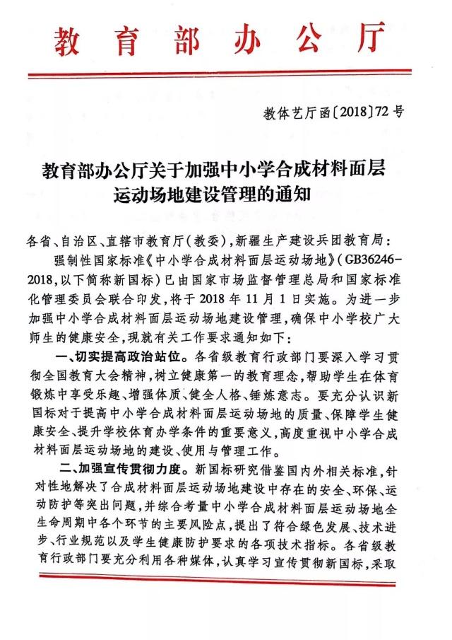 为进一步加强中小学合成材料面层运动场地建设管理,确保中小学校广大师生的健康安全,教育部办公厅发布关于加强中小学合成材料面层运动场地建设管理的通知。