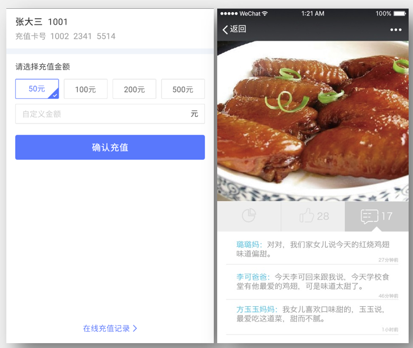 作为监护人,家长必须经常关注小孩的在校情况,而智盘?家长应用数字化解决方案把这种关注延伸到了家校通关注不到的食堂。通过手机应用,我们向家长们呈现了小孩在校的饮食生活。我们可以提供以下功能:1.绑定小孩餐卡,给小孩订餐; 2.查看小孩就餐记录及就餐明细; 3.接收每周、每月的小孩营养报告; 4.可根据小孩反馈,对食堂供餐进行点评和建议;5.可查看餐卡余额情况,并可对餐卡进行在线充值。
