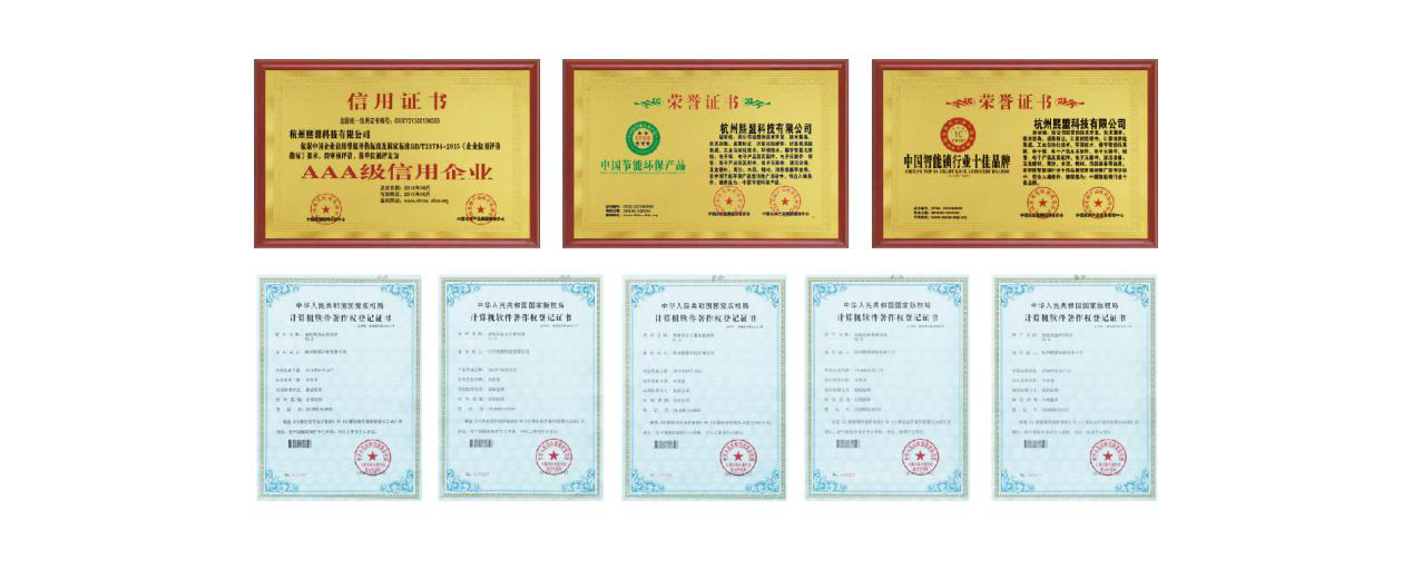 公司产品获得多项发明专利证书,软件著作权证书,公司被中国企业发展促进委员会和中国名牌产品质量管理中心评选为中国智能锁行业十佳品牌,中国环保节能产品。公司被中国质量信用认定中心认定为国家AAA级信用企业。