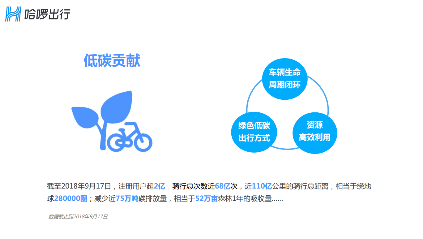 哈啰出行秉承科技推动出行进化的使命,致力于推动城市交通朝着智慧、绿色、低碳、共享的方向前进,积极参与城市交通规划建设,贡献力量,做城市智慧交通升级助手。
