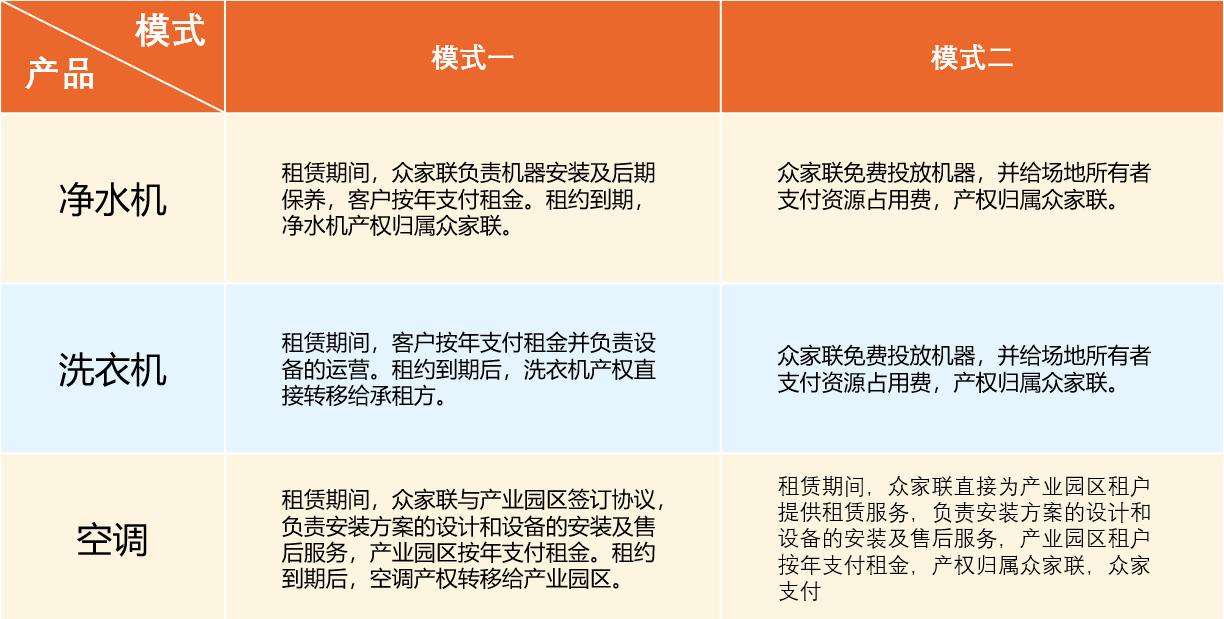针对办公产业园区,提供中央空调和净水器的租赁业务