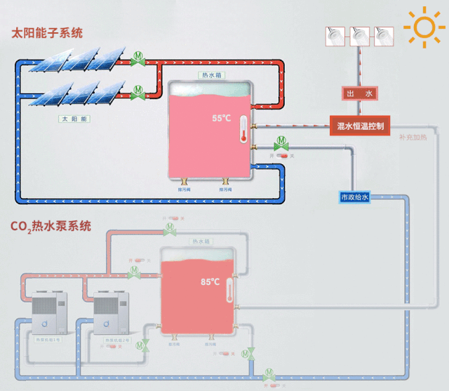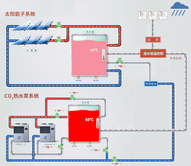 CO2热泵系统水箱设温度为85度,太阳能系统水箱温度设定为55度,当天起好的时候全部用太阳能系统,当天起不好的时候,启用CO2热泵系统补充热水。恒温控制设定根据用户出水需要设定。
