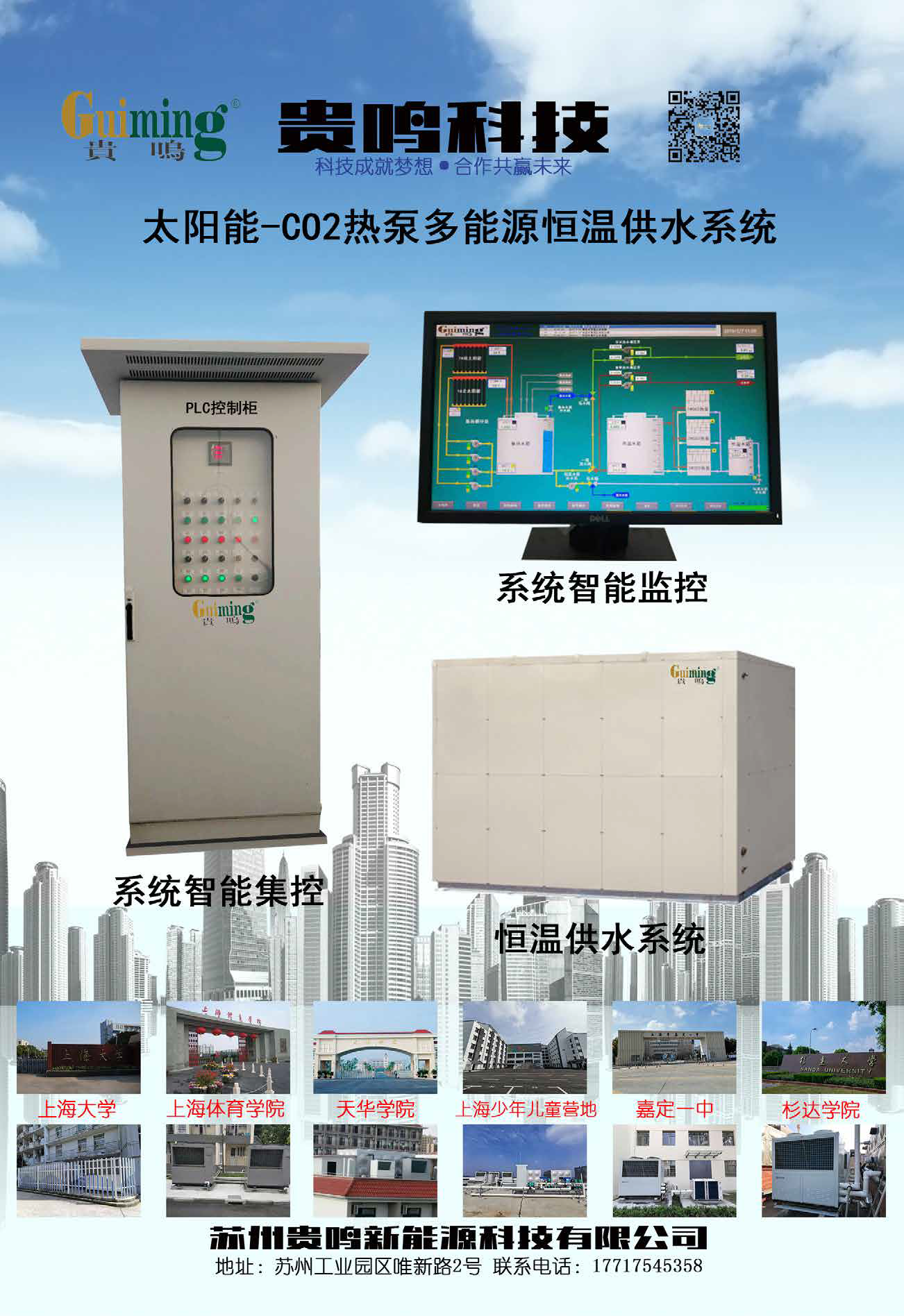 苏州贵鸣新能源科技有限公司是国内集自行研发、销售于一体的绿色环保技术服务有限公司。主要从事节能减排投资服务以及新能源领域的技术开发和推广应用。公司本着绿能生态、节能减排、舒适保障为理念。采用太阳能+C02 热泵多能恒温供水系统技术,为学校、企业提供环保、智慧、节能、低碳、安全保障型的热水系统、120° C 高温涂布风设备、零下30° C 环境供暖技术方案。