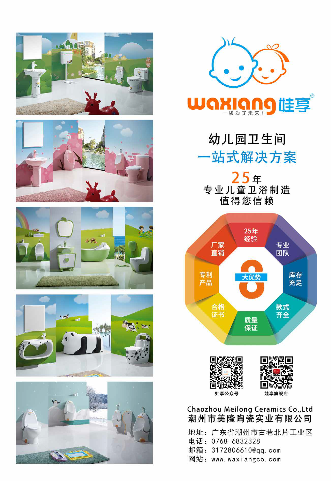 WAXIANG 娃享——潮州市美隆陶瓷实业有限公司旗下儿童卫浴品牌,专注于儿童卫浴产品的研发、生产和销售,公司坚持独立创新、精益生产和优质服务的原则,持续不断地为给孩子一个安全舒适的卫浴环境而努力,二十五年来深受国内外上万家幼儿园及早教中心的一致好评;娃享儿童卫浴产品系列有:儿童坐便器、儿童洗手盆、儿童小便斗、儿童蹲便器、儿童浴室柜和儿童浴缸等。