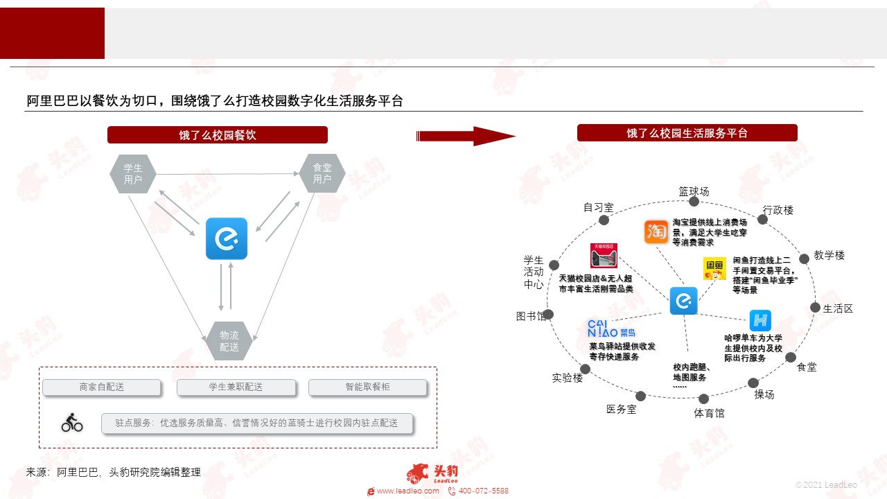 阿里以饿了么建立服务以及流量入口,在原有用户存量中进一步细分人群需求,进场大学校园。依托原有电商零售等平台的庞大用户存量,阿里布局多业务矩阵协同合力,基于高校新餐饮、新零售和新生活的场景,塑造升级校园服务。