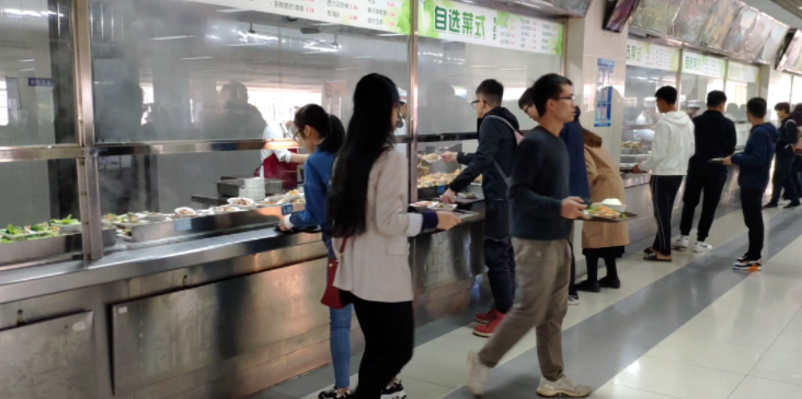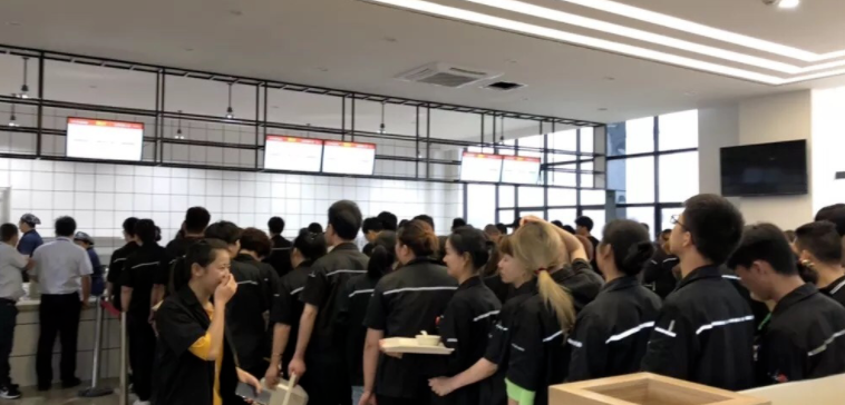 采用窗口打餐模式,客户到窗口前挑选菜品,由食堂厨工进行打菜,主要耗费时间在排队上,选菜、打餐、结账平均20秒一人,10人的队伍,完成取餐结算需要排队200秒。