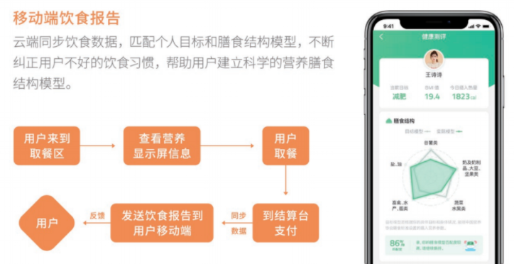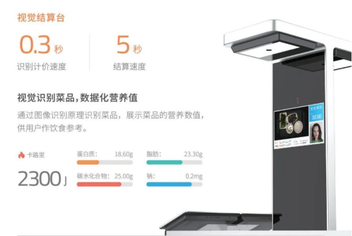 除了结算速度外,朴食科技视觉结算台更能通过识别菜品,分析菜品的营养元素,生成用户专属的移动端饮食报告,为用户健康就餐提供科学依据。为就餐加速之余,更为就餐增添健康。