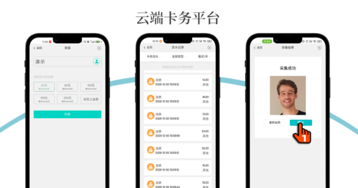 用户在移动端即可完成卡务充值、流水查询。可随时随地在手机完成充值、查询等操作,节省10-30分钟。对于在校无法携带手机的学生,家长亦可绑定孩子的账号为其进行充值,并可随时进行流水查询,了解学生消费情况。同时朴食科技配套智能产品均可支持人脸识别,用户在移动端录入人脸即可使用人脸识别支付功能。