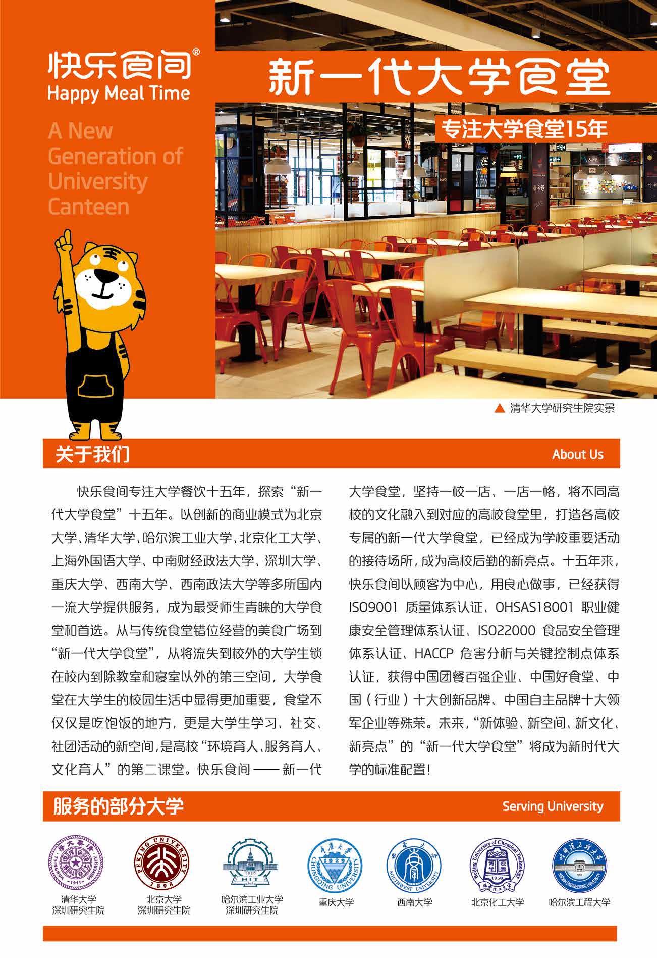 快乐食间专注大学餐饮十五年,探索“新一代大学食堂”十五年。以创新的商业模式为北京大学、清华大学、哈尔滨工业大学、北京化工大学、上海外国语大学、中南财经政法大学、深圳大学、重庆大学、西南大学、西南政法大学等30 余所国内一流大学提供服务,每天服务30 万人次,成为最受师生青睐的大学食堂和首选。从与传统食堂错位经营的美食广场到“新一代大学食堂”,从将流失到校外的大学生锁在校内到除教室和寝室以外的第三空间,大学食堂在大学生的校园生活中显得更加重要,食堂不仅仅是吃饱饭的地方,更是大学生学习、社交、社团活动的新空间,是高校“环境育人、服务育人、文化育人”的第二课堂。快乐食间- 新一代大学食堂,坚持一校一店、一店一格,将不同高校的文化融入到对应的高校食堂里,打造各高校专属的新一代大学食堂,已经成为学校重要活动的接待场所,成为高校后勤的新亮点。
