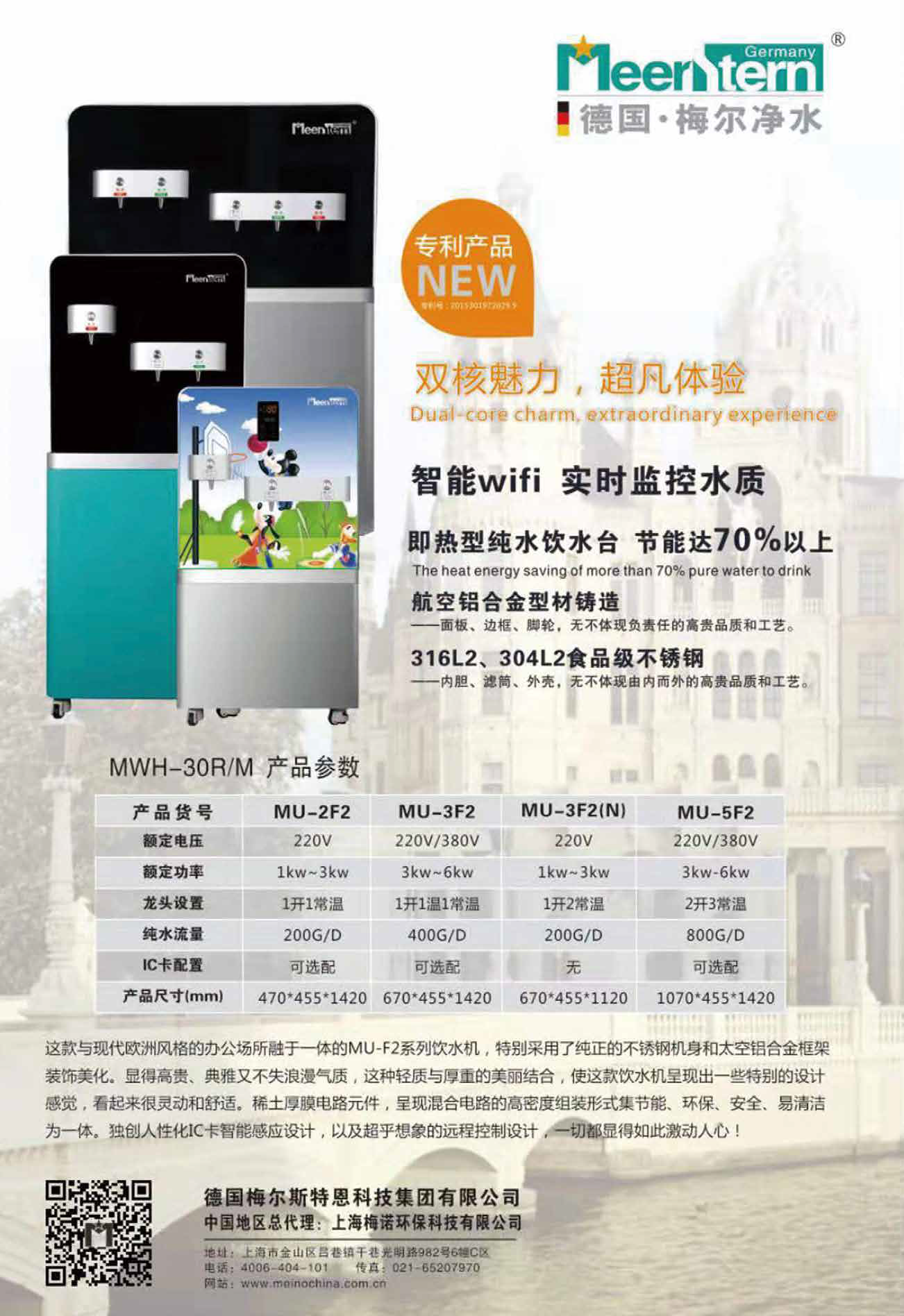 上海梅诺环保科技有限公司成立于1992 年,在二十多年的旅程中,公司致力于工业及民用水处理设备的科研、生产、销售及技术支持。2007 年梅诺公司开始与德国生产基地联合研制开发了“节能”型校园饮用水机、商务电开水器、中央净水机、中央软水机、末端直饮机、管线机、前置过滤器等“梅尔牌”系列的产品。产品畅销各地,深受消费者喜爱。