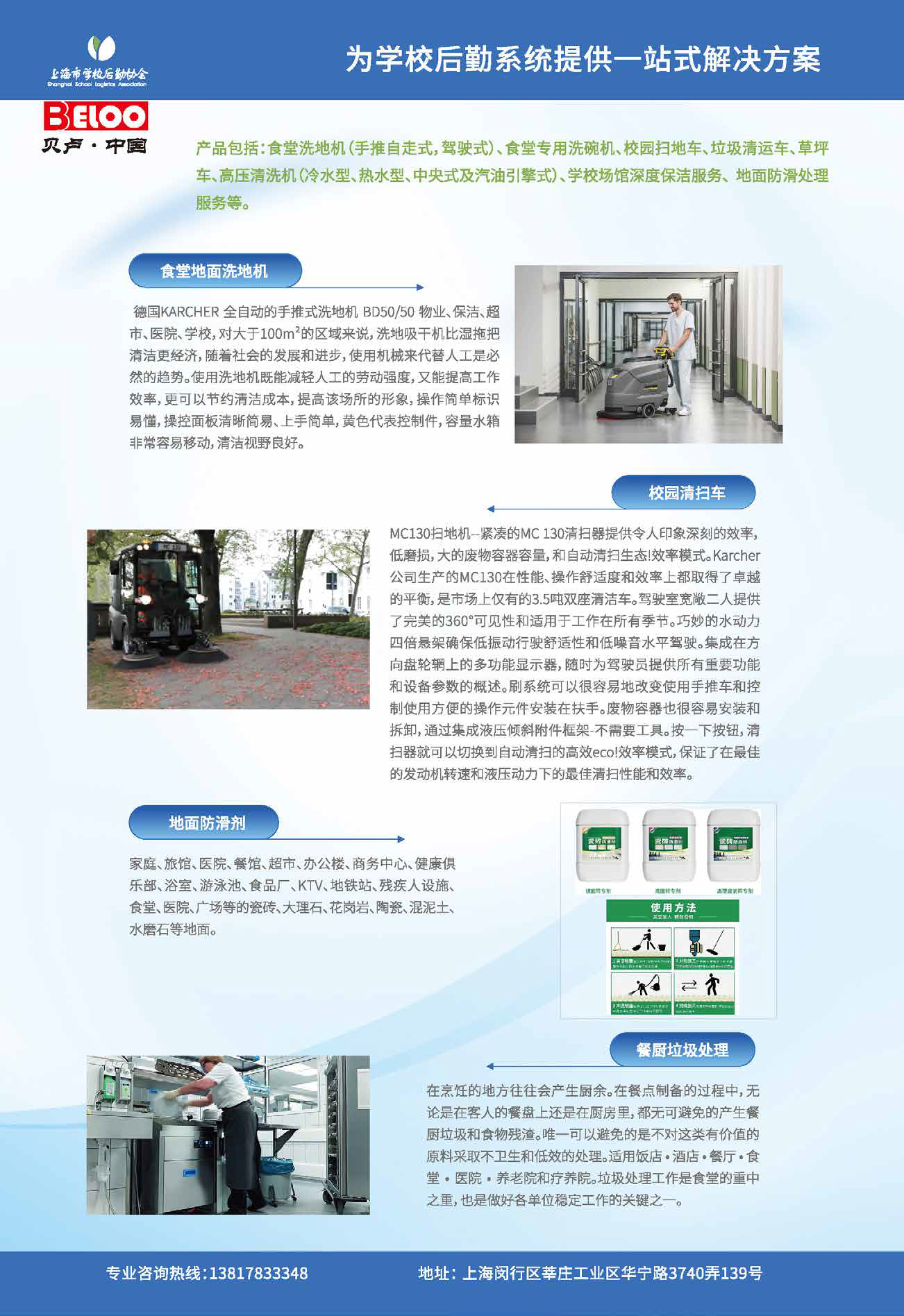 上海贝卢机械设备有限公司成立于2001年,至今已有将近20 年的经营历史,是由欧洲FLSTANT集团参股在中国上海设立并销售校园后勤设备,同时为校园后勤提供专业服务的专业化公司,公司致力于为全国高校和上海地区学校提供后勤的全套解决方案,公司在欧洲设有代表处负责公司的海外联络等事宜,该中心拥有雄厚的技术力量和专业的配套设施,在上海地区设有制造工厂。客户涵盖包括医院、虹桥枢纽、虹桥和浦东机场、市政工程、学校、化工业、环保行业、汽车制造、商业、物业保洁等领域。产品包括:食堂专用洗碗机、垃圾分类系统、高压清洗机(冷水型、热水型、中央式及汽油引擎式),洗地机(手推自走式,驾驶式),扫地车、高空作业车、草坪车 防滑剂面砖或地面石材的防滑改造服务、物业保洁服务、停车场管理等,多年来本公司在高校后勤等领域享有崇高威望和影响力。